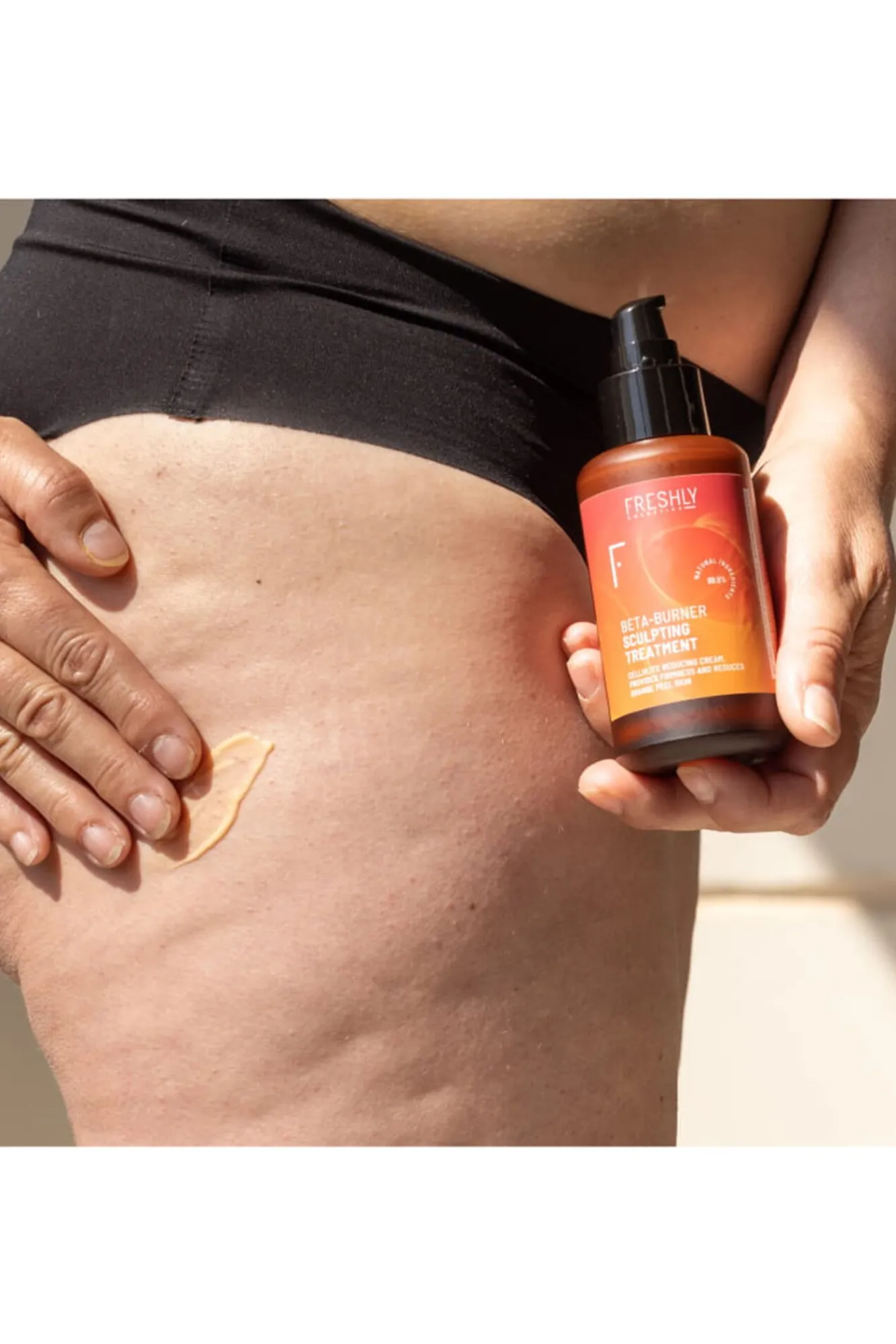 2. Después de la rutina facial (no utilizar el producto en el rostro), aplica a diario 2-3 pulsaciones en las zonas donde haya celulitis, sobre la piel limpia y seca.