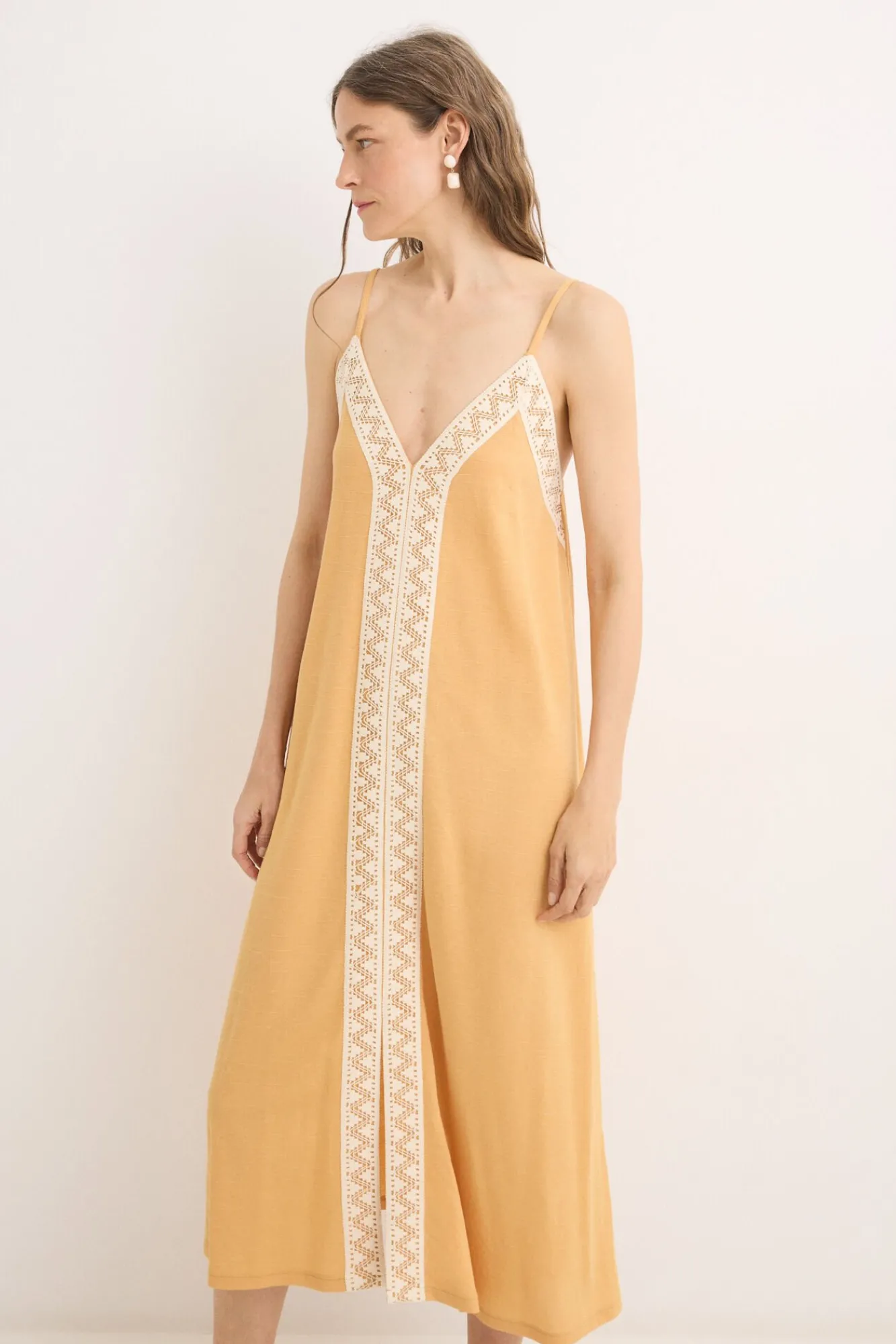-Escote pico con detalle de cinta de crochet hasta el bajo