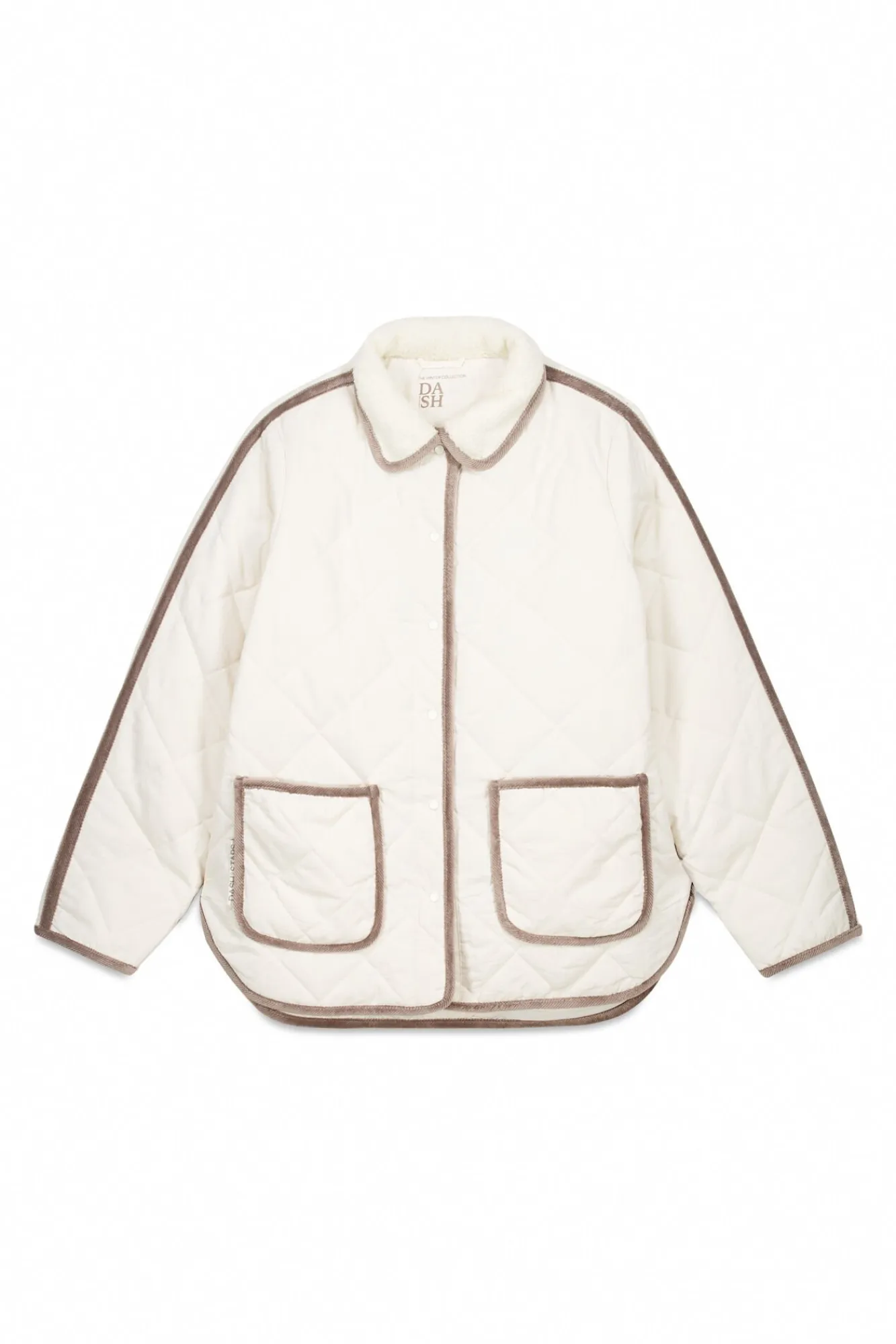 – Bajo, bajo manga, bolsilos, cuello y apertura central avivados a contraste.