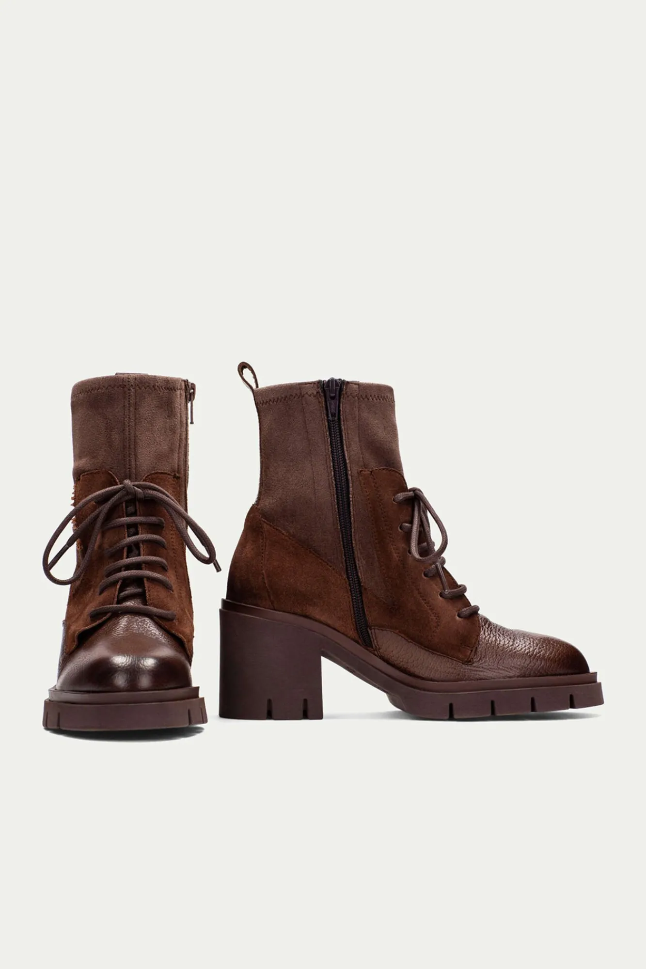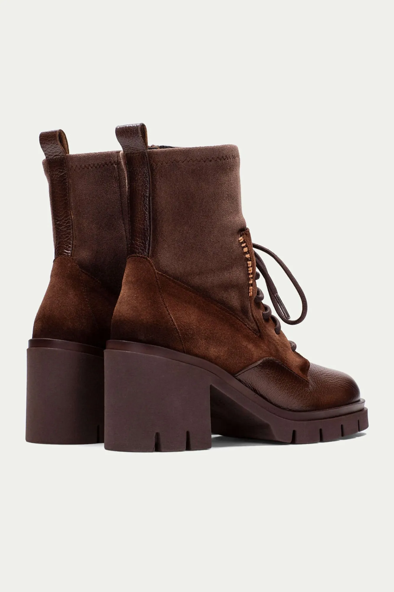 – Elaborado en piel texturizada, serraje y serraje que combina tejido elástico