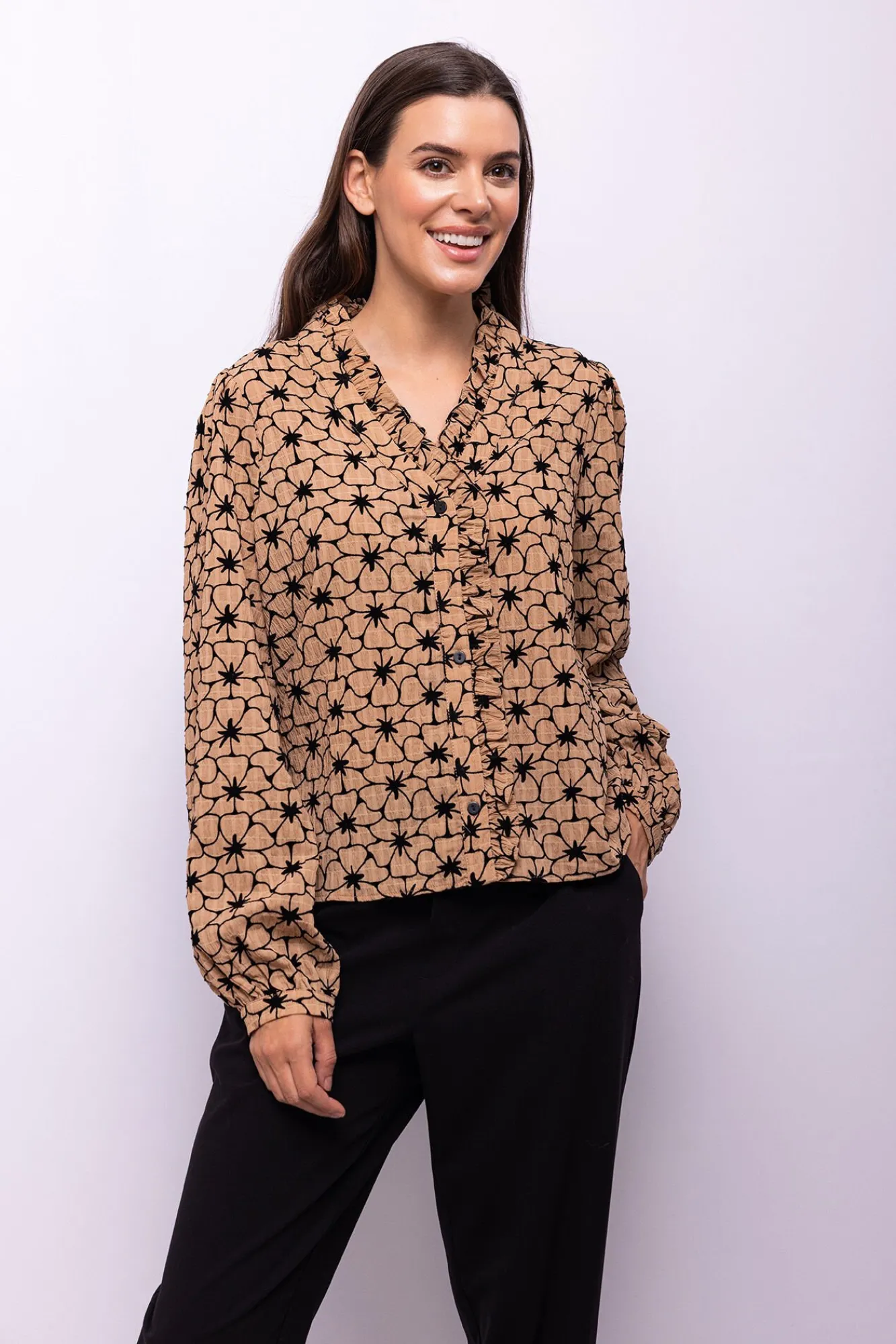 – Detalle de volantes en cuello y frontal