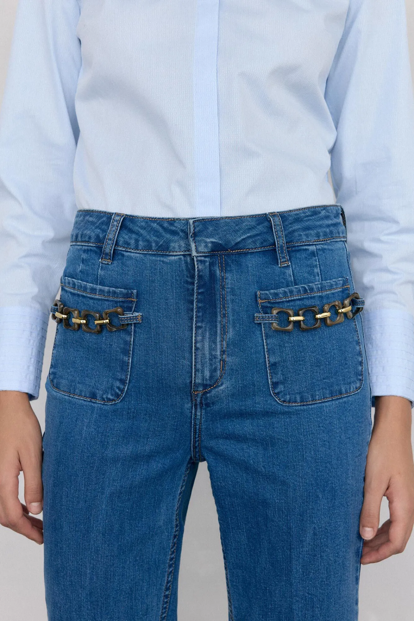 – Bolsillos de parche con detalle de cadena en colores naturales Bolsillos de parche y pinzas en la parte posterior Cierre mediante cremallera oculta por tapeta y enganche metálico