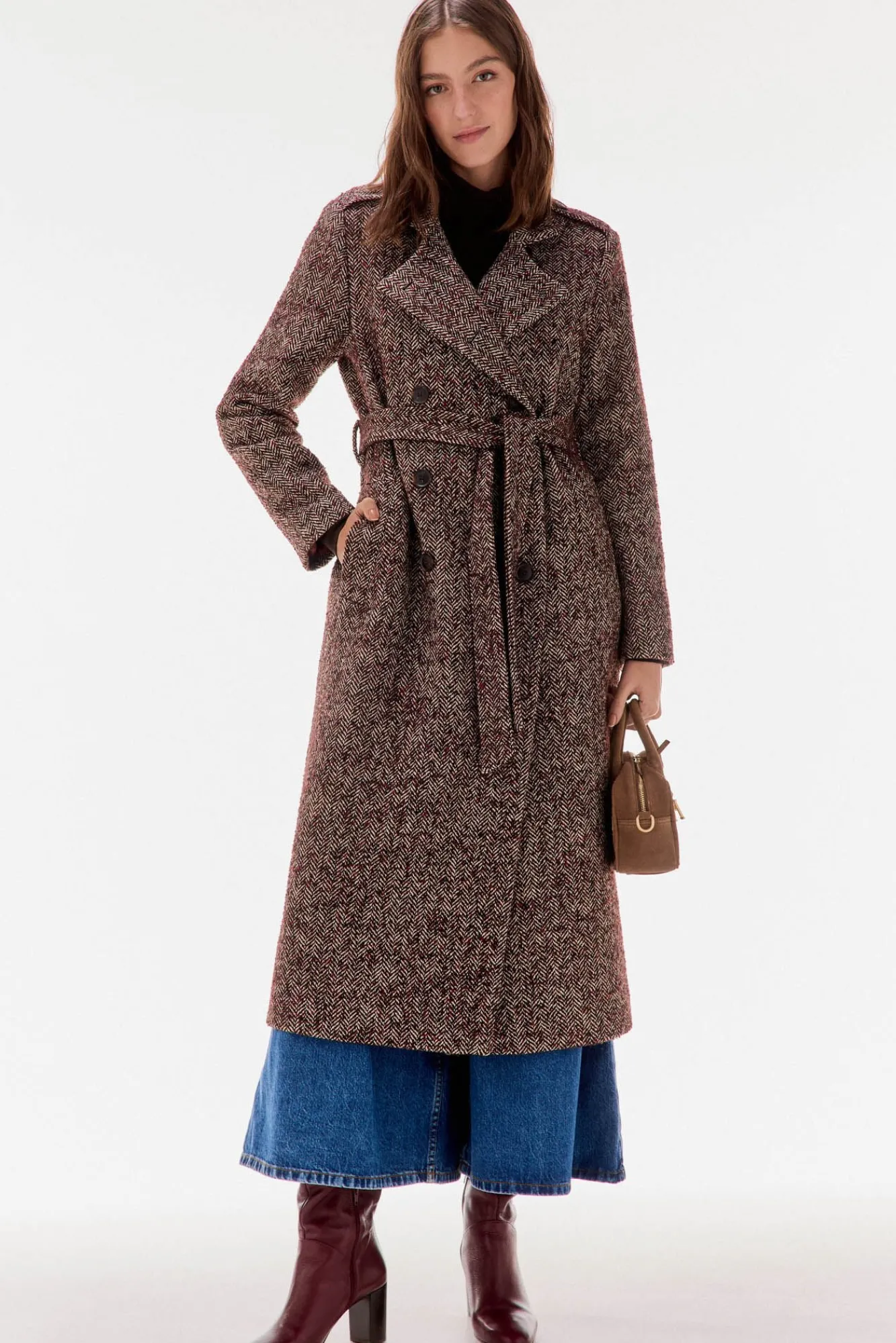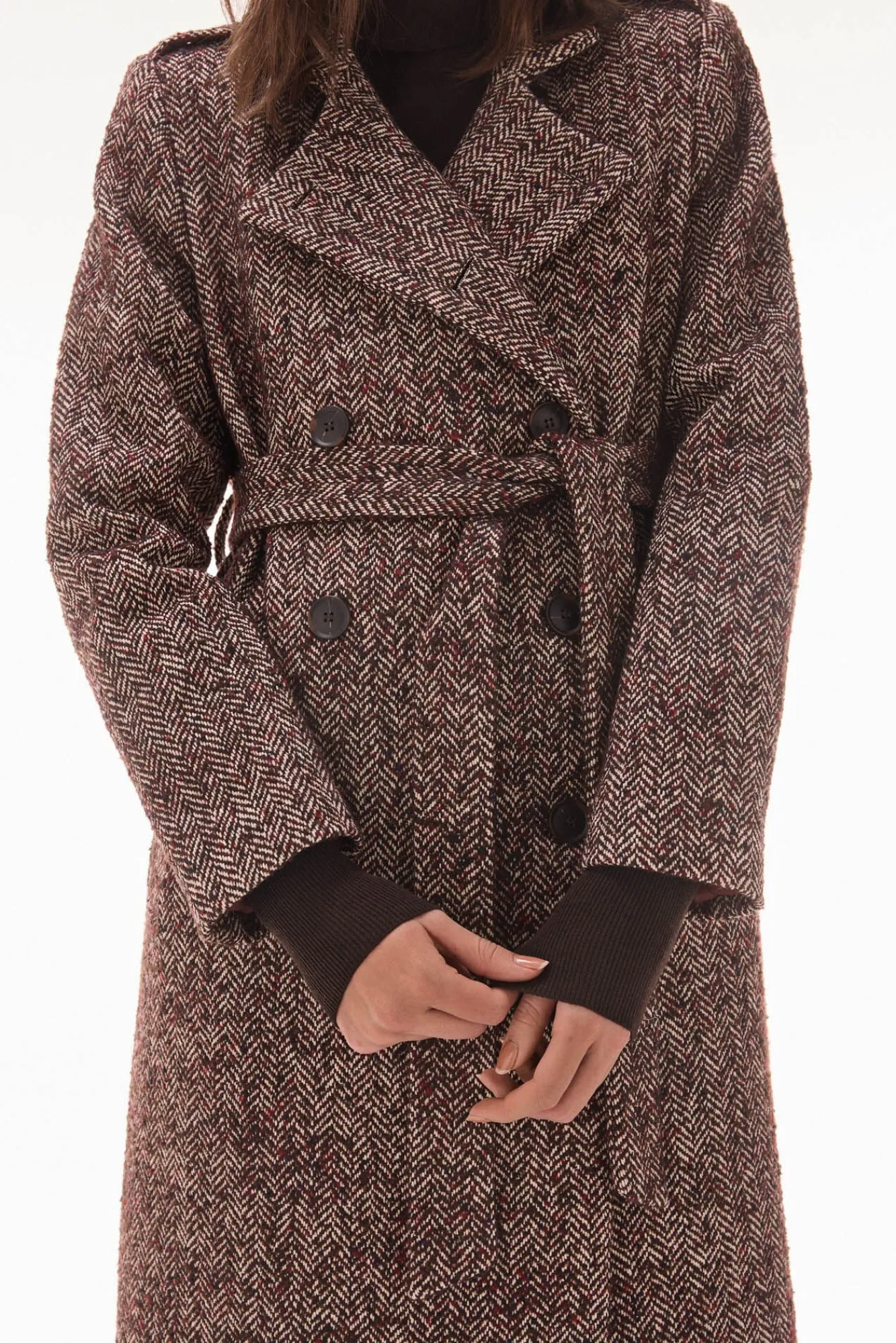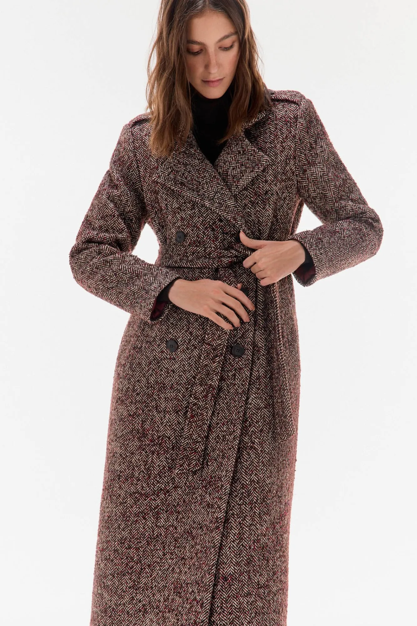 – Doble botonadura con cinturón del mismo tejido