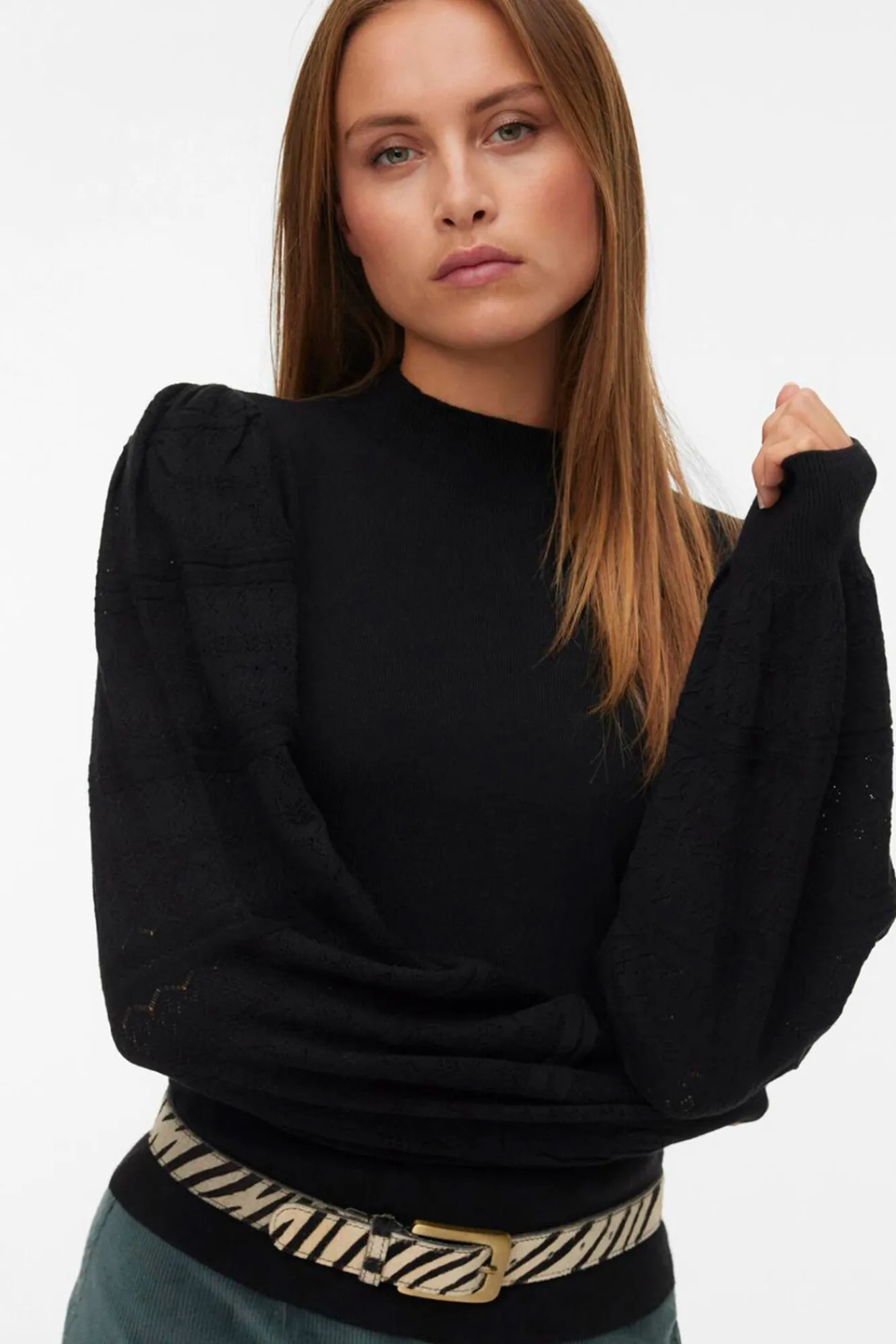 – Cuello redondo y detalle ribeteado en cuello y puños.