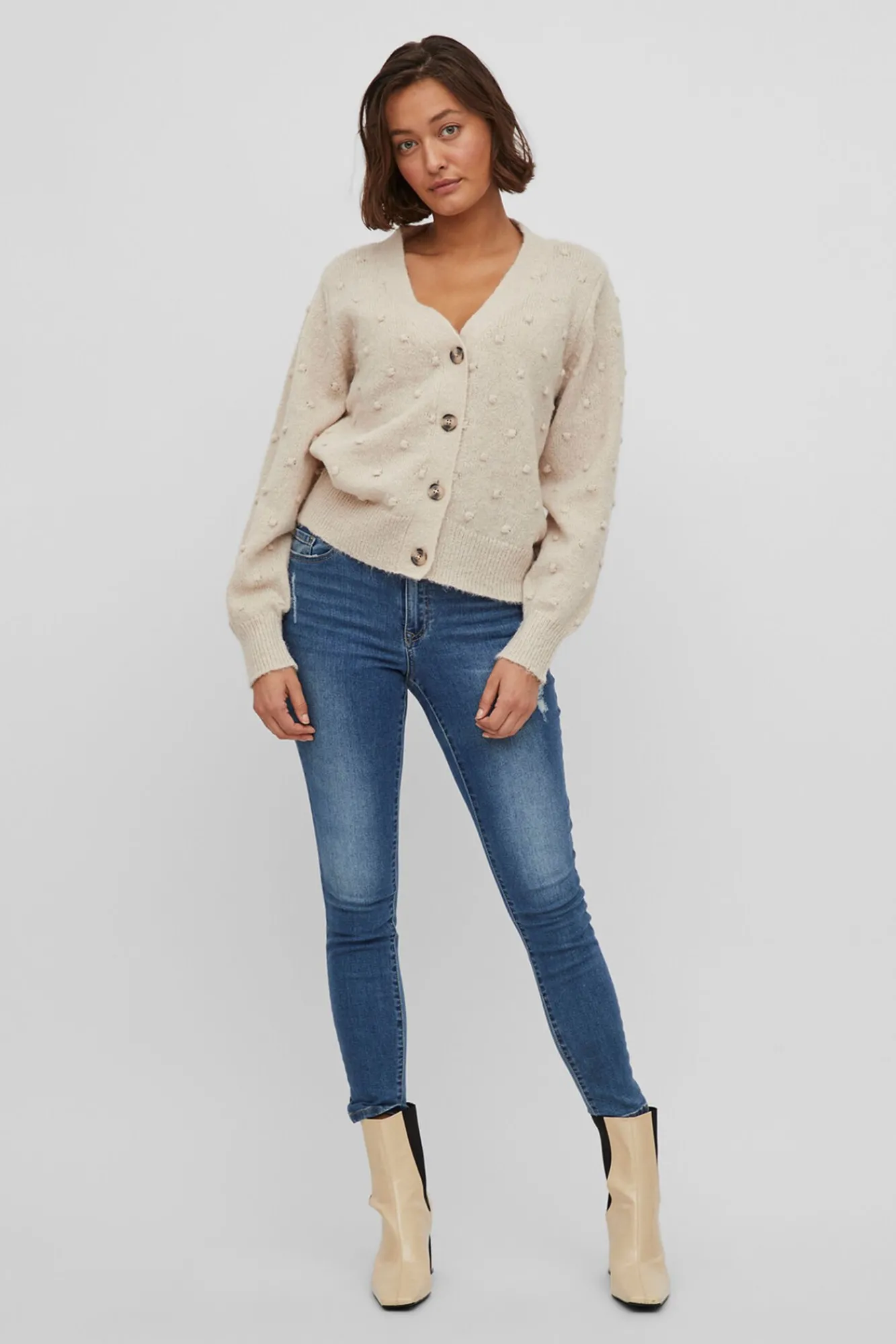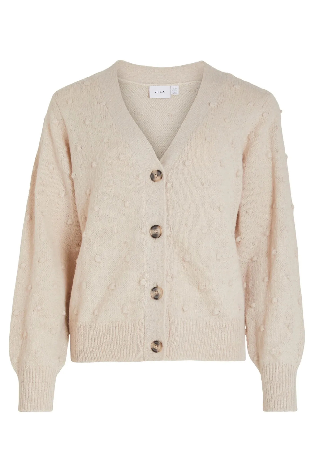 – Escote en forma de V con cierre frontal de botones