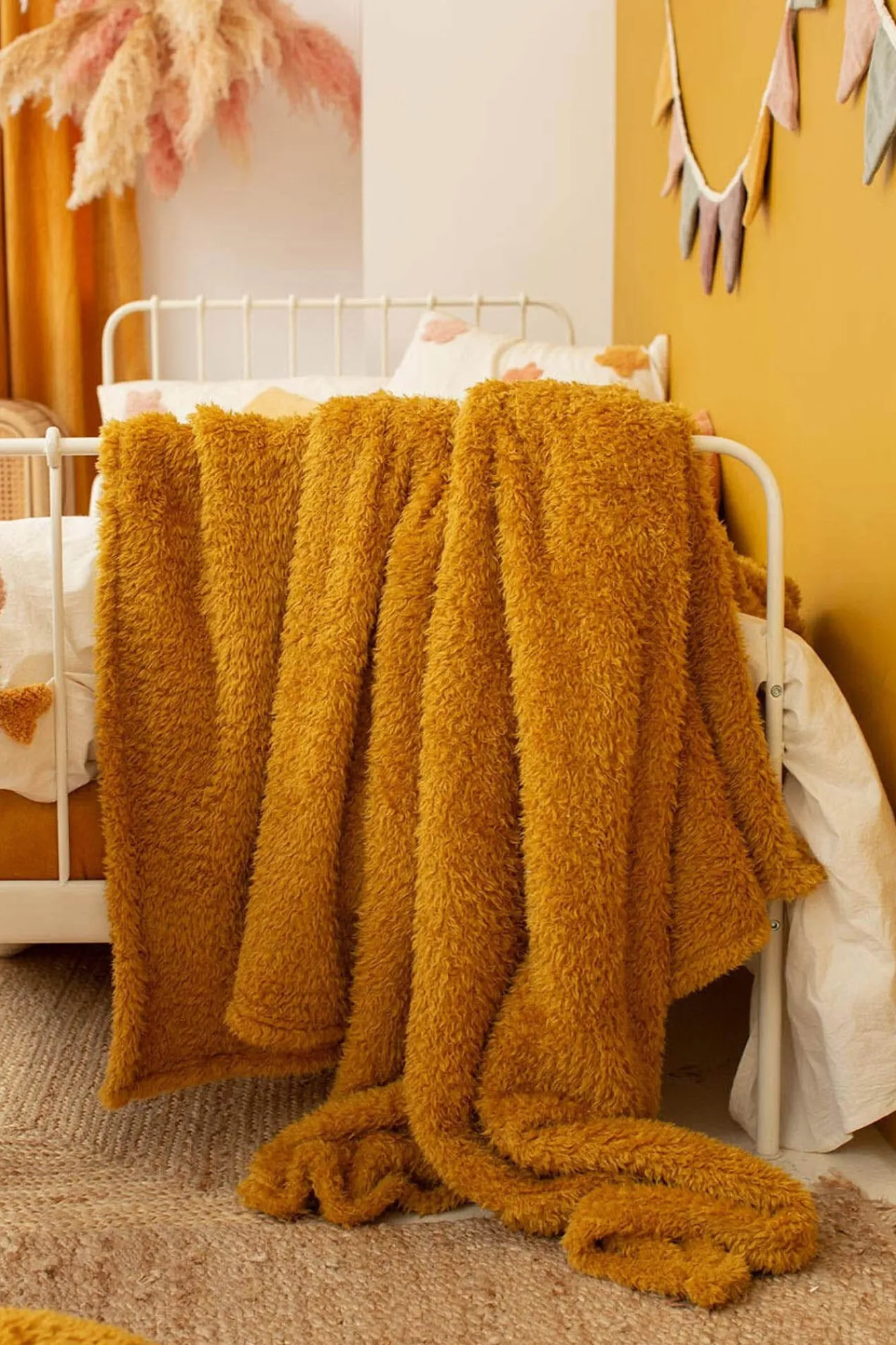 -Añade calidez y estilo a tu hogar con el plaid mostaza Tedy.