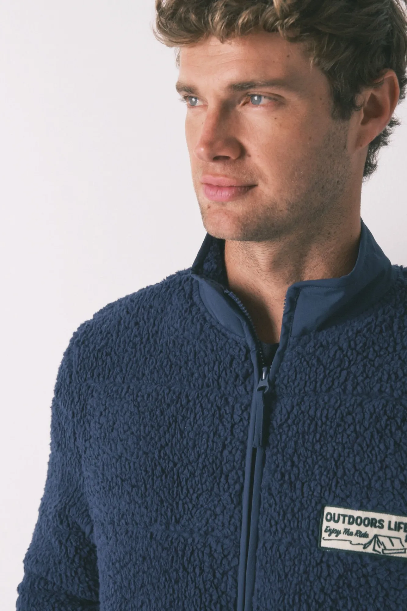 – Cuello elevado, parche bordado en el pecho y abrochado con cremallera central.