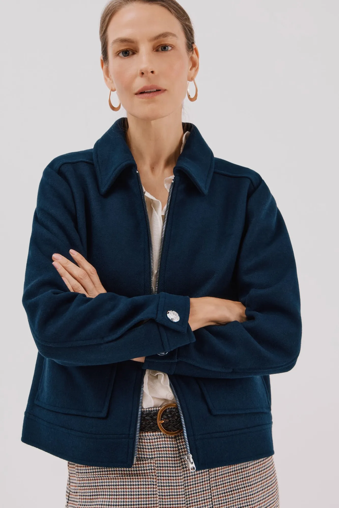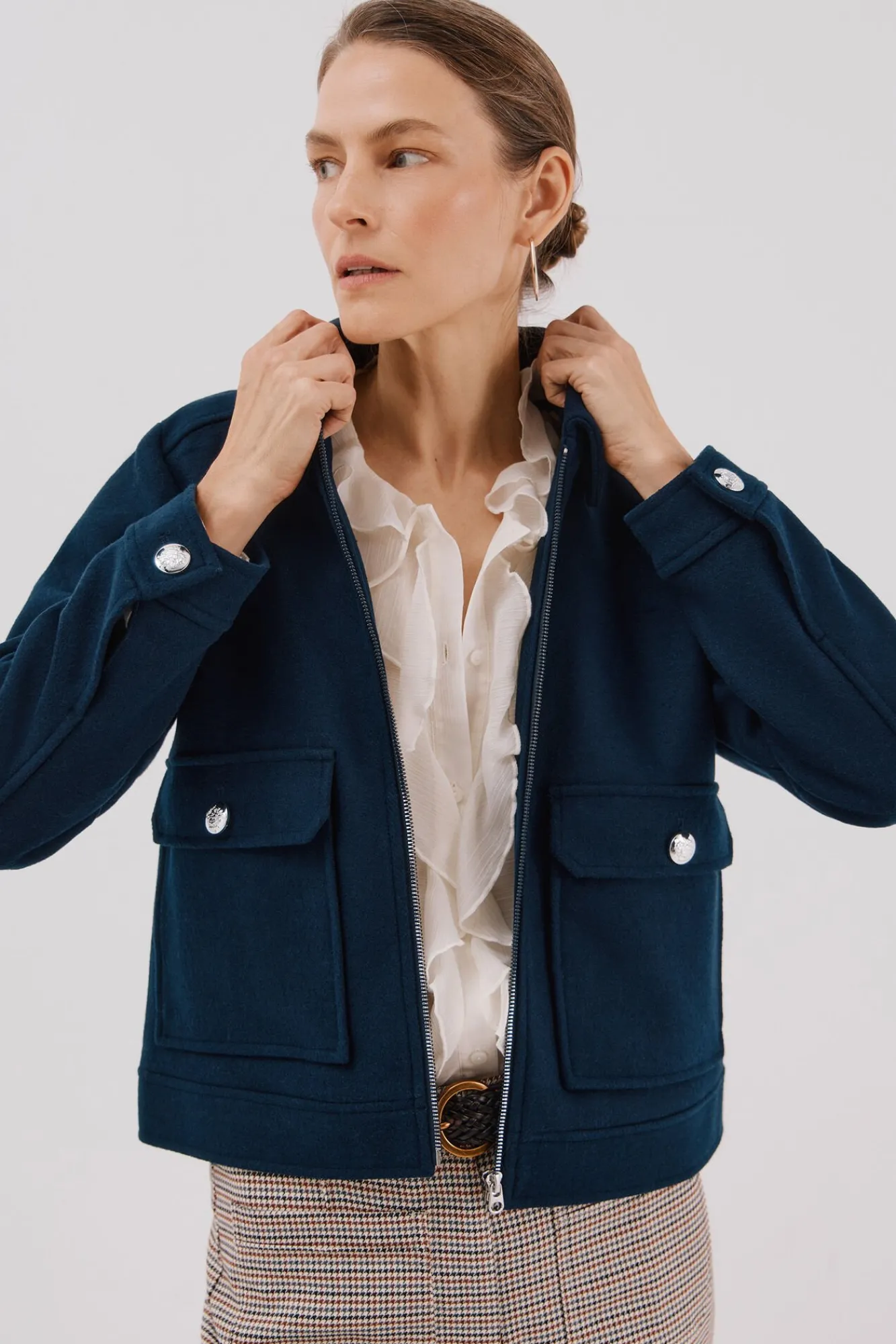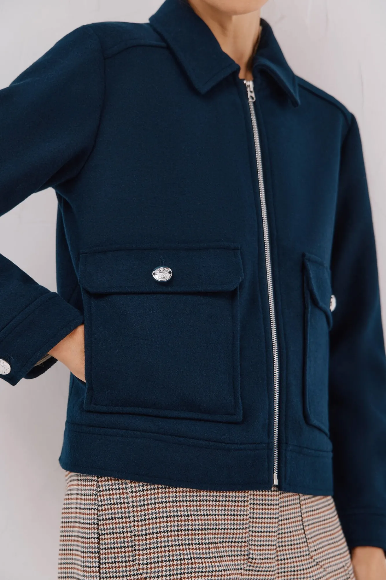 -Bolsillos de parche con botones plateados.