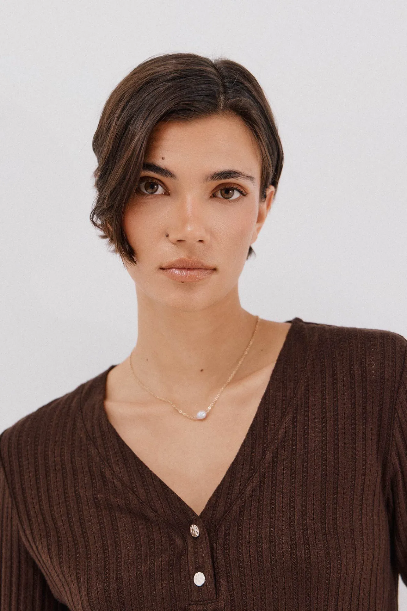 – Escote panadero con tapeta y botones dorados