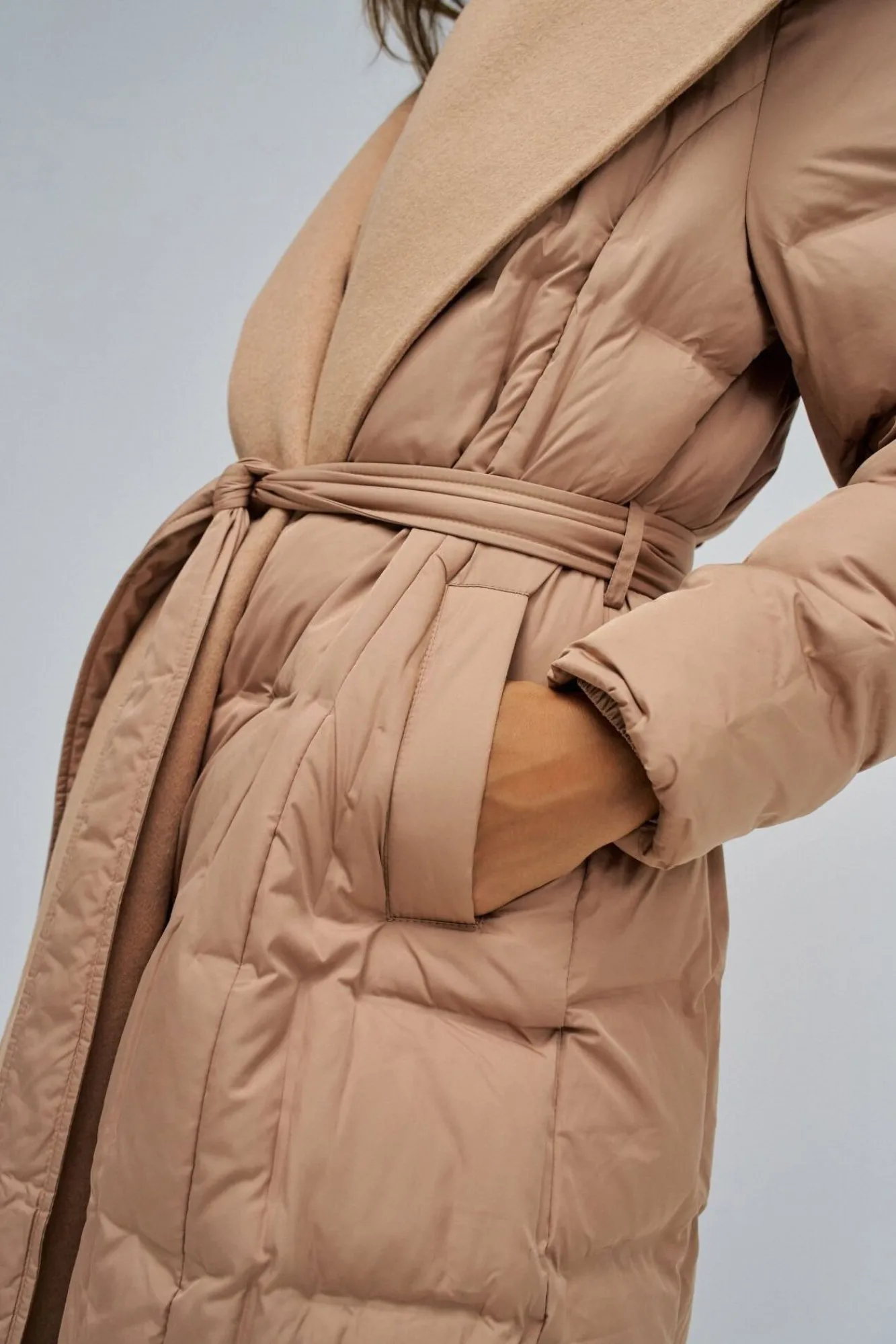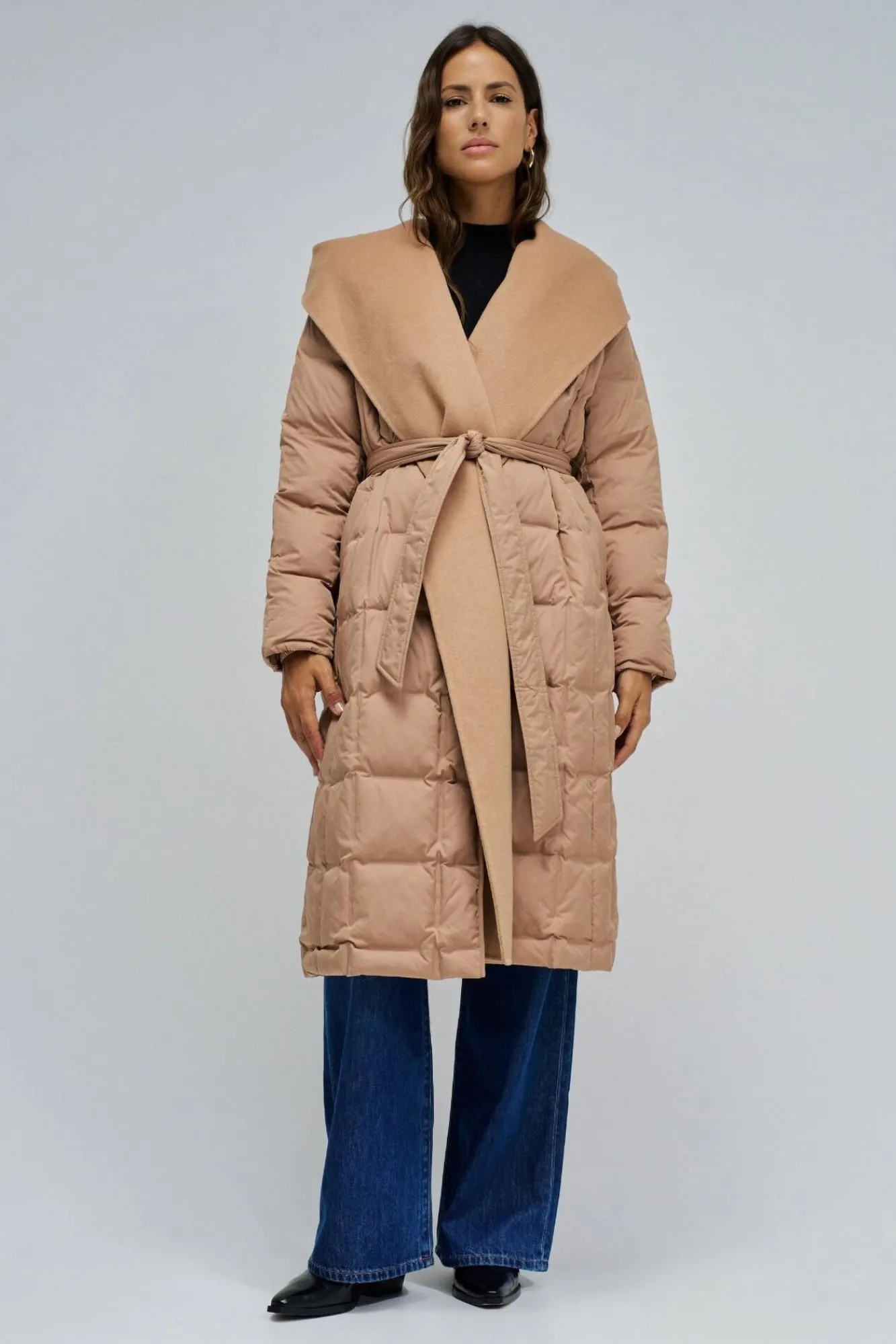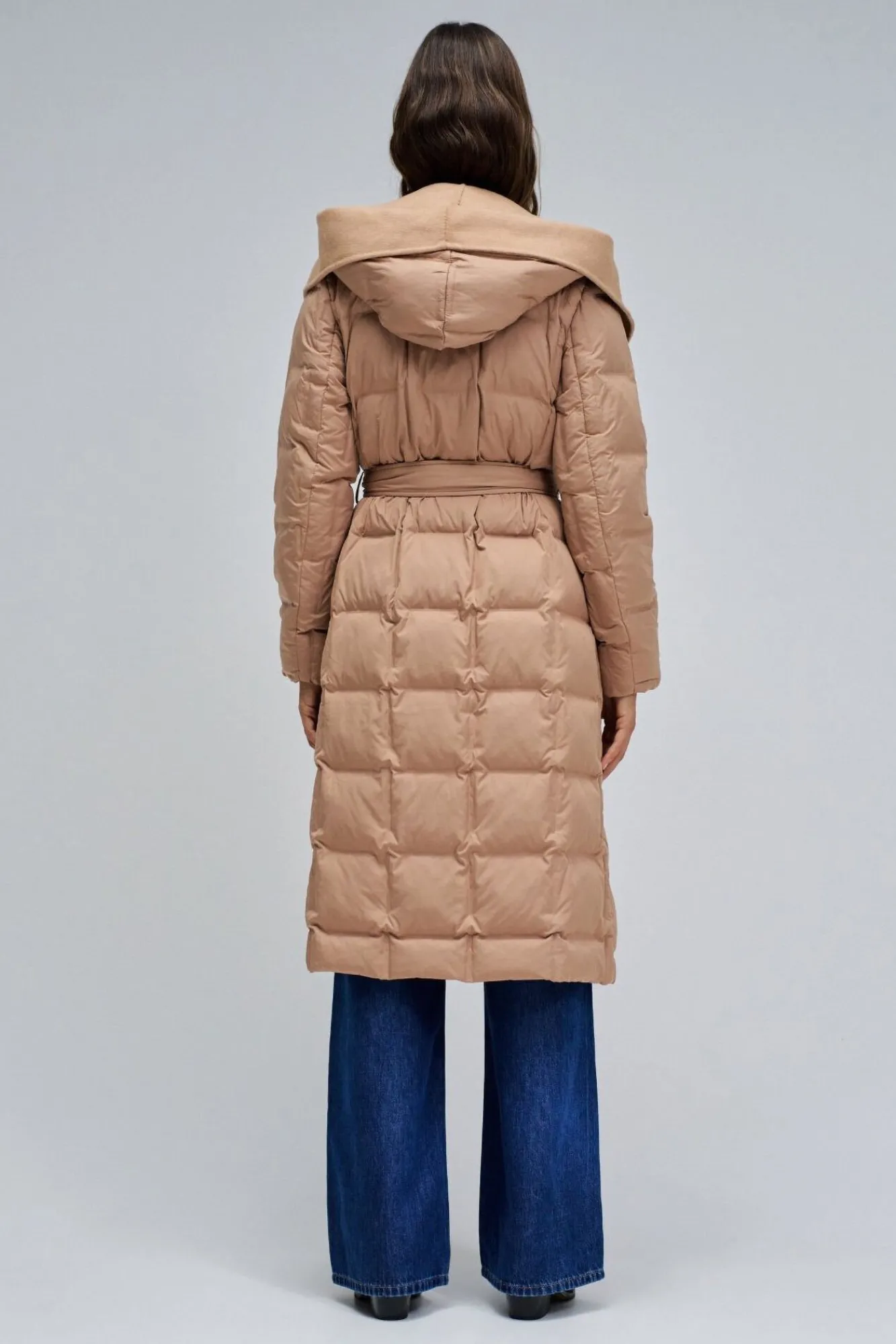 – El escote cruzado y el cinturón desmontable definen la silueta con elegancia, mientras que la bufanda de paño transforma el look según tu ritmo, añadiendo confort extra