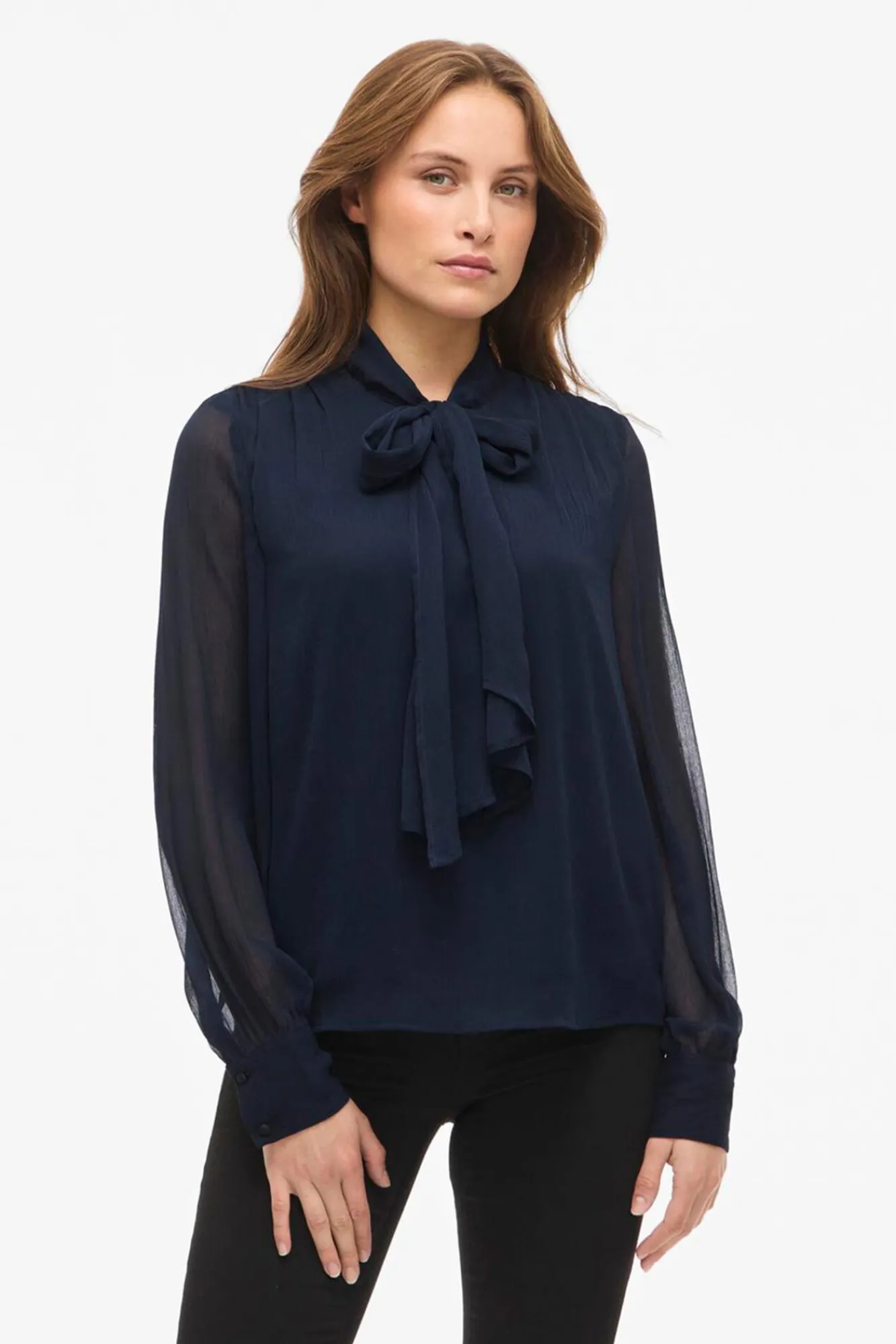 – Escote en forma de V con lazada