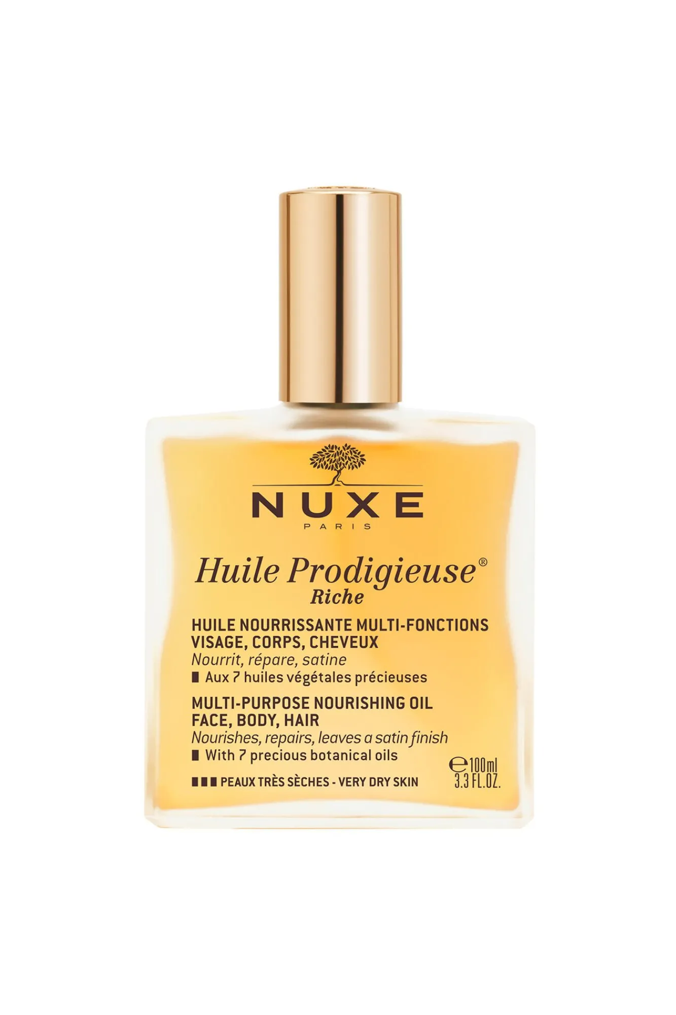 MODO DE USO:Utilizar Huile Prodigieuse® todo el año, tanto en invierno como en verano, sobre el rostro, el cuerpo y el cabello.En el rostro, se aplica mediante movimientos de alisado desde el centro hacia el contorno del rostro. Se puede utilizar solo o mezclando unas gotas en la palma de la mano con su crema NUXE.En el cuerpo, se aplica mediante movimientos circulares (busto, piernas…) y en las estrías.En el cabello, se utiliza como aceite capilar en los tallos y las puntas tan a menudo como sea necesario. Para un efecto de tratamiento intenso, se aplica una a dos veces por semana como mascarilla durante 10 minutos antes del champú.